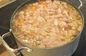- Lisää sekaan lihaliemikuutiot (maun mukaan), keittojuurekset, pippurit sekä pilkotut ja kevyesti pannulla (voissa) ruskistetut HK:n siniset.
